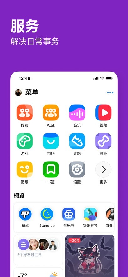 1、软件还支持提供音乐播放与离线下载、短视频创作与直播、影视资源观看、内置小游戏等多元娱乐服务。