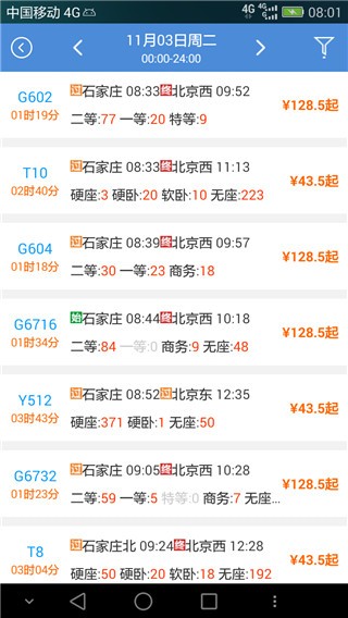 3、支持中文、拼音首字母及手写字母混合搜索,搭配人性化过滤功能,能够实现快速锁定目标车次。