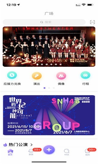 1、打开口袋48,在首页可以查看使用毕业寄语、成员、演出、云握手等热门功能;