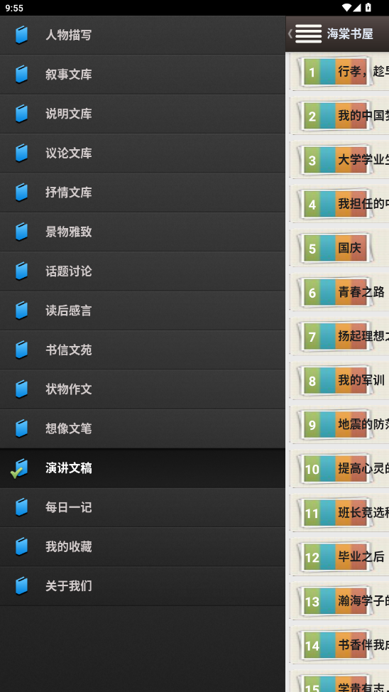 3、点开界面左上角的三道杠可供读者选择大的分类,包括叙事文库、抒情文库等栏目。