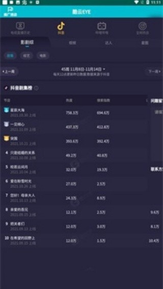 酷云eye能给你提供实时收视率查询的手机助手,让你能及时洞察影视行业风云,展开深入影视数据核心的探索。开启实时追踪影视剧收视率以及口碑热度的便捷通道,让你能熟悉影视市场动态、观众喜好变化以及行业发展趋势。获得独家行业报告,还有深度数据洞察以及精准营销策略建议,成为影视行业数据领域的洞察专家,留下具有前瞻性的行业见解印记。
