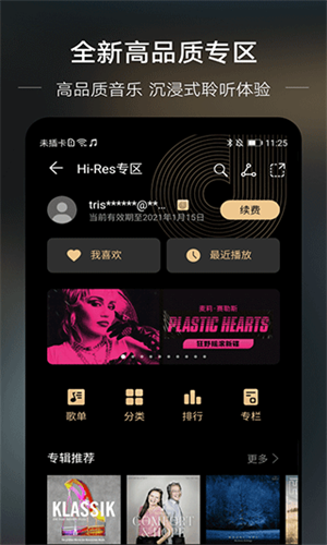 3、沉浸式音乐厅板块,采用深色设计与光影效果还原真实音乐厅观感,汇聚大师专辑与品质内容。