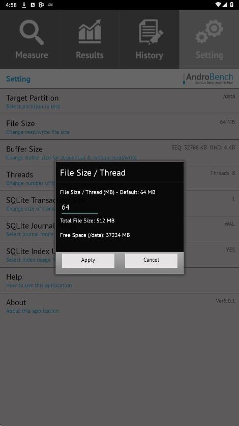 换一换AndroBench是一款可以为安卓设备提供存储性能测试的专用工具,安全性的进行检查,让用户能够更好的了解自己的设备。提供四种核心测试模式,全面评估设备存储性能。除了读写速度,还测试存储设备在不同负载下的稳定性,提供详细的性能波动数据,帮助用户评估存储设备是否可靠。测试后会生成详细的报告,并支持存储性能的横向对比,帮助用户了解不同设备以及不同存储类型之间的性能差异。能够有效测试不同类型的存储介质,帮助用户辨别设备硬件性能。