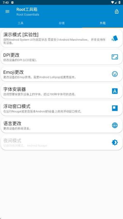 换一换Root工具箱是一款功能丰富的root工具,需获取Root权限后使用。支持应用的备份与卸载,帮助用户轻松管理手机中的应用程序,释放存储空间,提升系统运行效率。提供系统分区的挂载与读写控制,用户可以自由访问和编辑系统文件,实现深度系统定制。支持常规重启与恢复模式等多种重启方式,满足用户在不同场景下的重启需求。提供丰富的字体和主题资源,用户可以自由更换手机字体和主题,打造个性化的设备界面。支持修改系统默认设置,满足用户对设备界面的个性化需求。