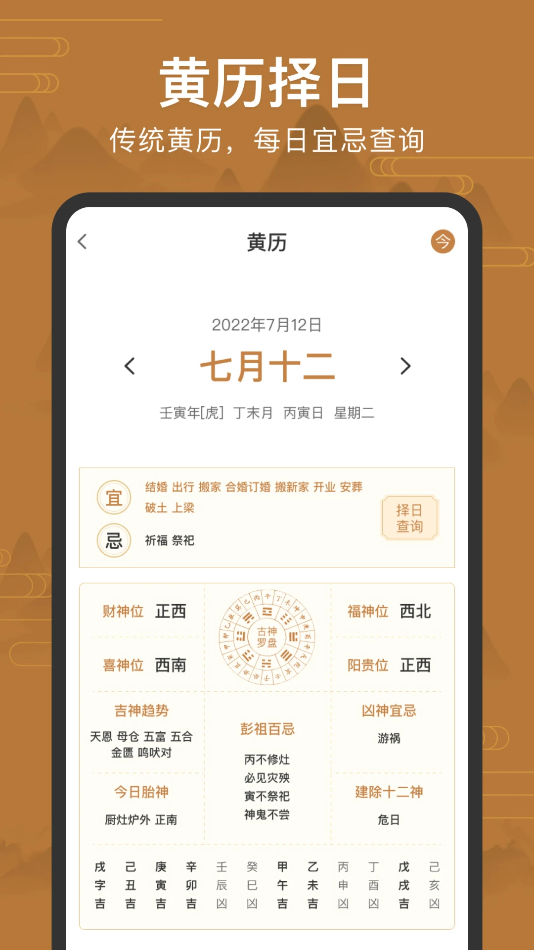 1、内置中国传统老黄历,支持农历查询、黄道吉日挑选及宜忌查询,将风水智慧融入日常生活。