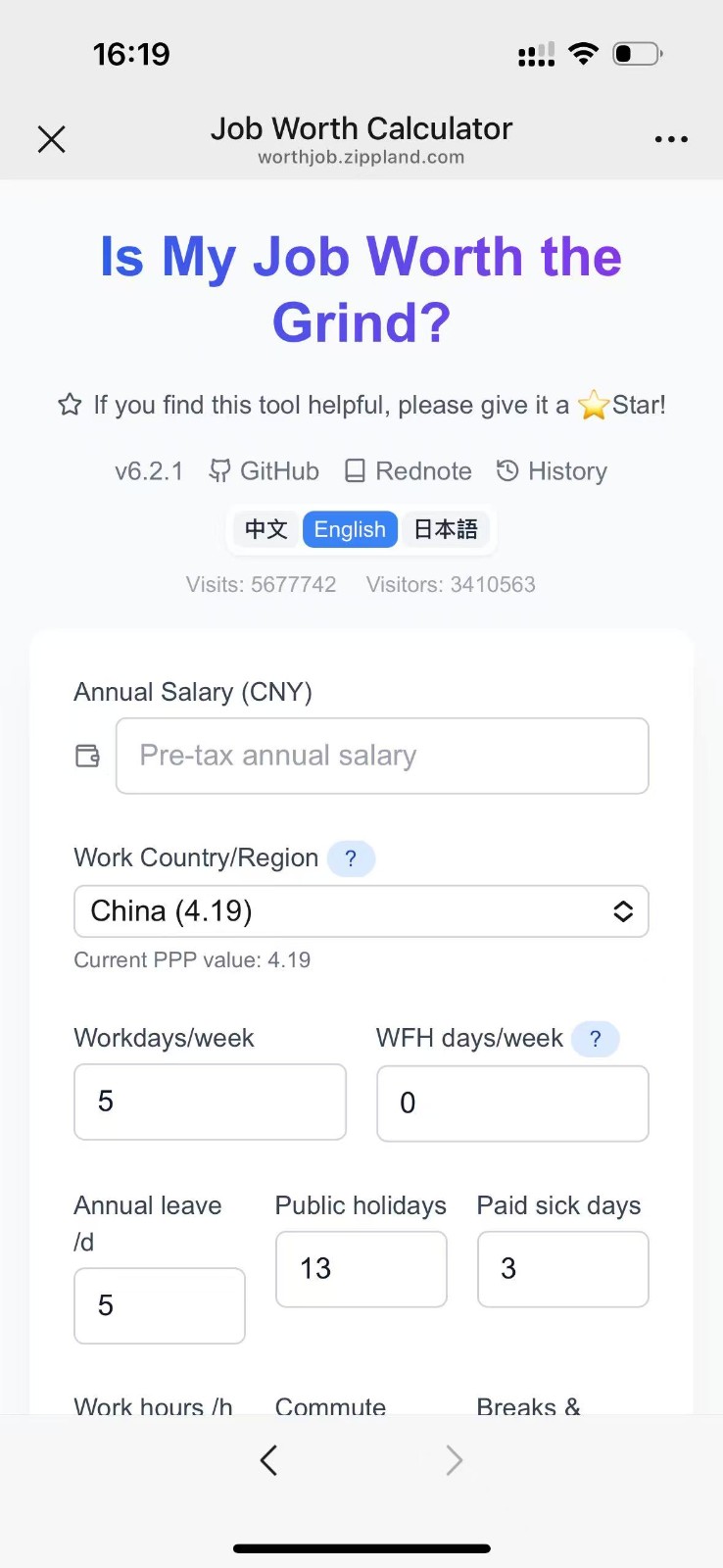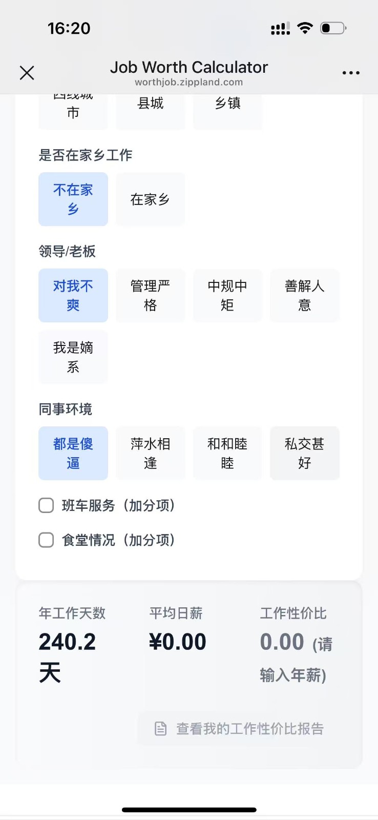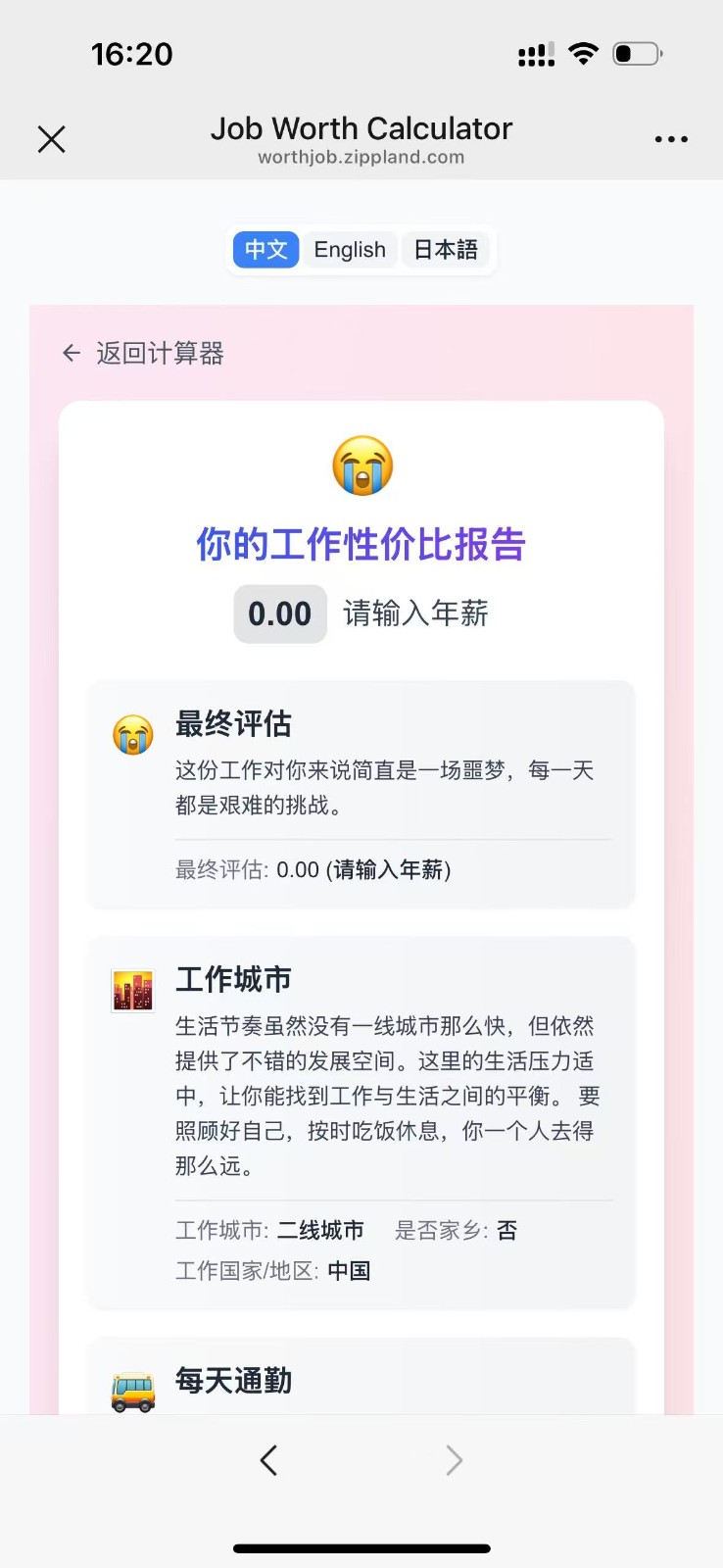换一换工作性价比计算器是一款支持多方面分析职业价值的实用性工具,可以用来帮助职场人快速评估收入与投入的真实比率。通过整合薪资、工时、通勤、压力等关键指标,工作性价比计算器将模糊的工作感受转化为清晰的数据结果。深度整合多维数据,将薪资福利与隐性消耗同步纳入评估。 智能算法自动加权,精准反映地域与行业差异影响。结果呈现直观易懂,以雷达图与评分表双重方式展示。无论是求职决策还是现状复盘,工作性价比计算器都能提供客观参考,让每一次职业选择都更有依据。