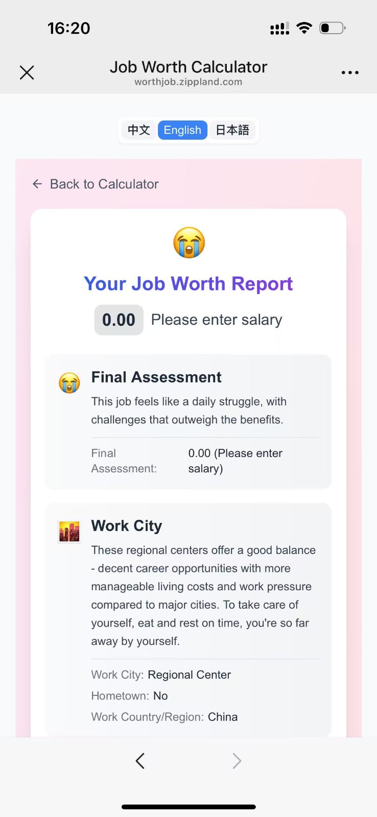 工作性价比计算器能够帮助用户科学性的分析自己的工作价值,帮助用户更好地管理职业发展,提供全面的职业决策支持。支持自定义评估模板,可依据个人关注点调整参数比重,内置典型岗位数据库,方便快速对照与参考比对。提供历史记录保存功能,便于追踪职业变迁轨迹。操作流程高度流畅,三步内即可完成完整评估,帮快速做出决策。