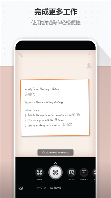 3、名片识别功能可自动提取联系人信息,并直接保存至手机通讯录或OneNote。