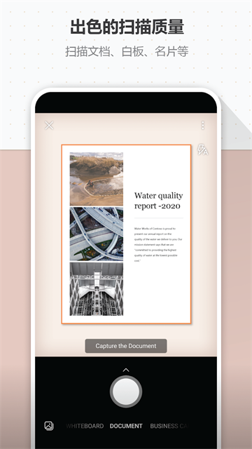1、多种拍摄模式,针对白板、文档、名片等不同对象自动优化色彩与对比度。