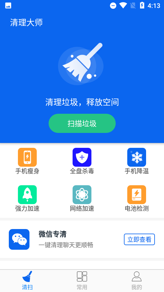 换一换飞速手机清理大师解决手机长期使用后积累的各类冗余数据与性能瓶颈问题,多项智能扫描与清理引擎,帮助用户快速回收存储容量并提升系统响应速度。深度扫描应用缓存、残留安装包、临时日志文件以及广告垃圾等,并在清理前提供可视化的文件分类预览,勾选需保留的内容,避免误删重要数据。针对微信、QQ等高频社交应用产生的海量聊天文件,独立的专清模块,可精准识别并清理过期图片、视频及语音缓存。飞速手机清理大师集成了内存加速、后台进程管理、电池优化及手机降温等辅助功能。