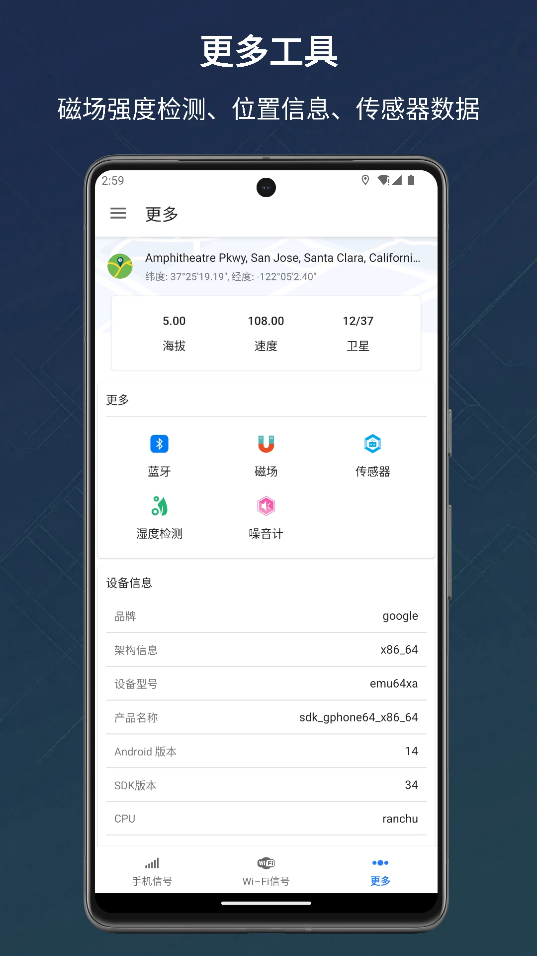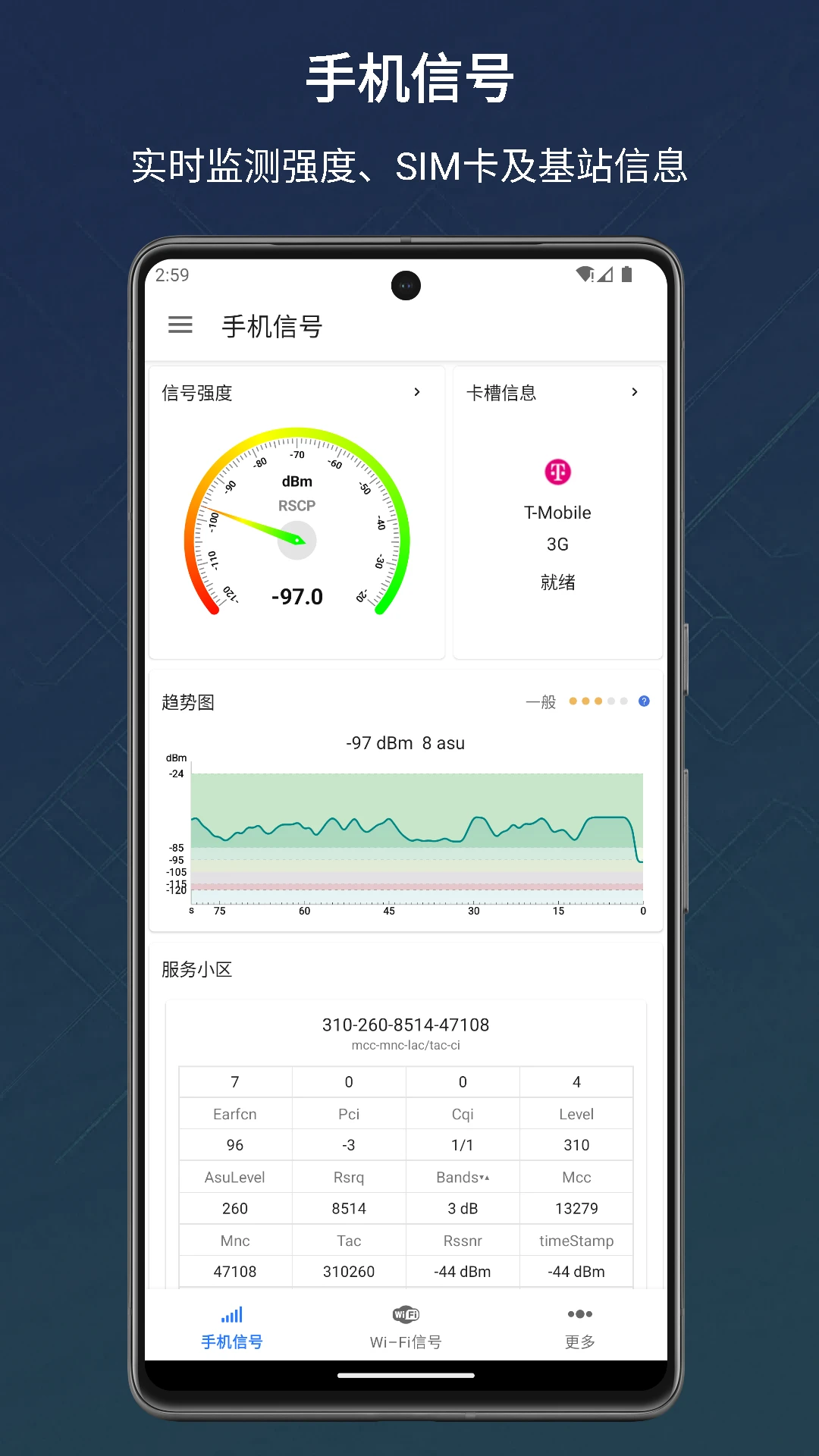 信号检测仪将手机转化为专业网络诊断工具。它打破了系统默认设置中仅显示信号格数的粗略方式,将底层的dBm数值、基站代码、卫星编号等专业数据直接呈现给用户。其图形化的WiFi信道分析功能非常实用,能够快速帮助用户找到家里路由器最不拥堵的信道,从而提升上网体验;提供的详细小区参数和GPS卫星详情,足以满足日常简单的网络质量评估和定位精度测试需求。