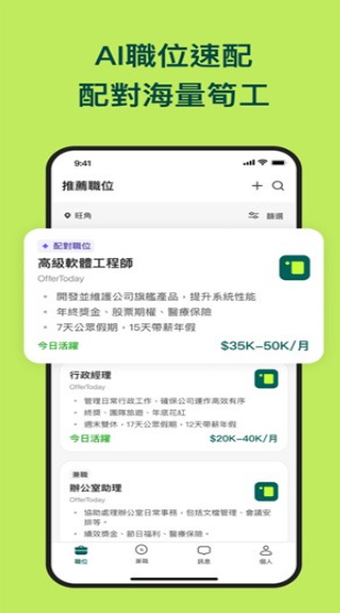换一换OfferToday是面向香港特别行政区推出的本地化智能招聘平台,持有香港官方颁发的职业介绍所牌照。专注于连接香港本地企业雇主与求职者,致力于通过移动互联网与AI技术重塑高效、直接的招聘体验。继承了母公司成熟的直聊模式,支持求职者与招聘方进行即时消息沟通,大幅缩短了从投递简历到安排面试的等待周期。OfferToday覆盖香港全行业的全职、兼职及临时岗位需求,并针对香港多语言环境优化了中文、英文及粤语的语言支持,为香港就业市场提供了一个垂直且高效的数字化招聘解决方案。