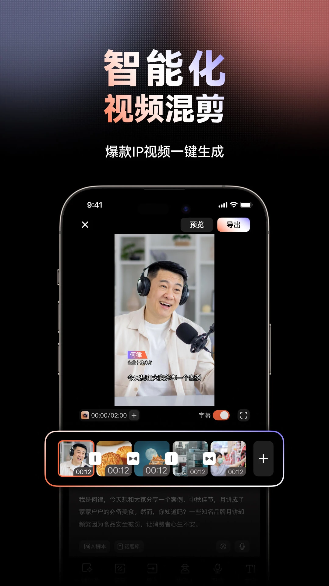 1、智能混剪功能,自动匹配素材与转场,快速生成高质量成品视频。