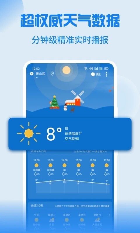2、未来24小时逐时天气预报与分钟级降水预报,精确提示雨雪开始与结束时间。