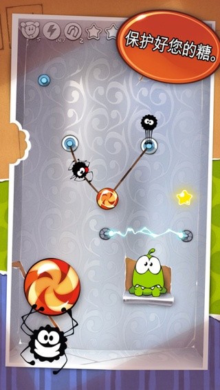 2、不断将糖果掉入怪物的嘴巴,达到关卡的目标。