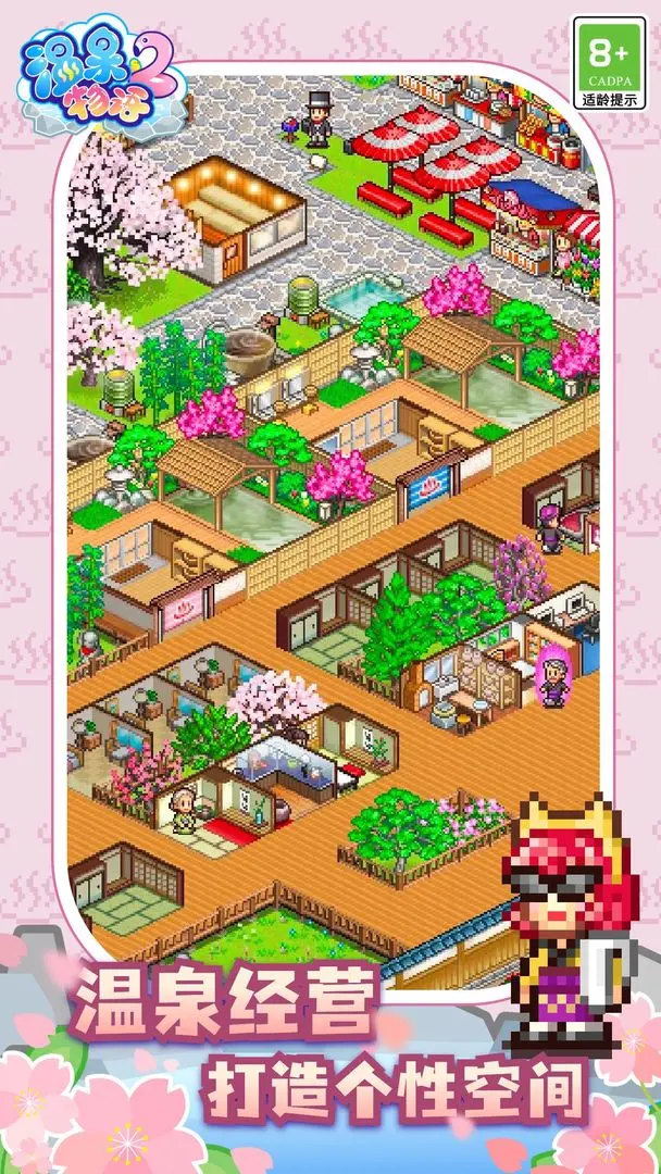 2、采用复古像素画风,搭配古朴木质建筑、雅致庭院与氤氲温泉热气,营造浓郁日式温泉乡村风情。