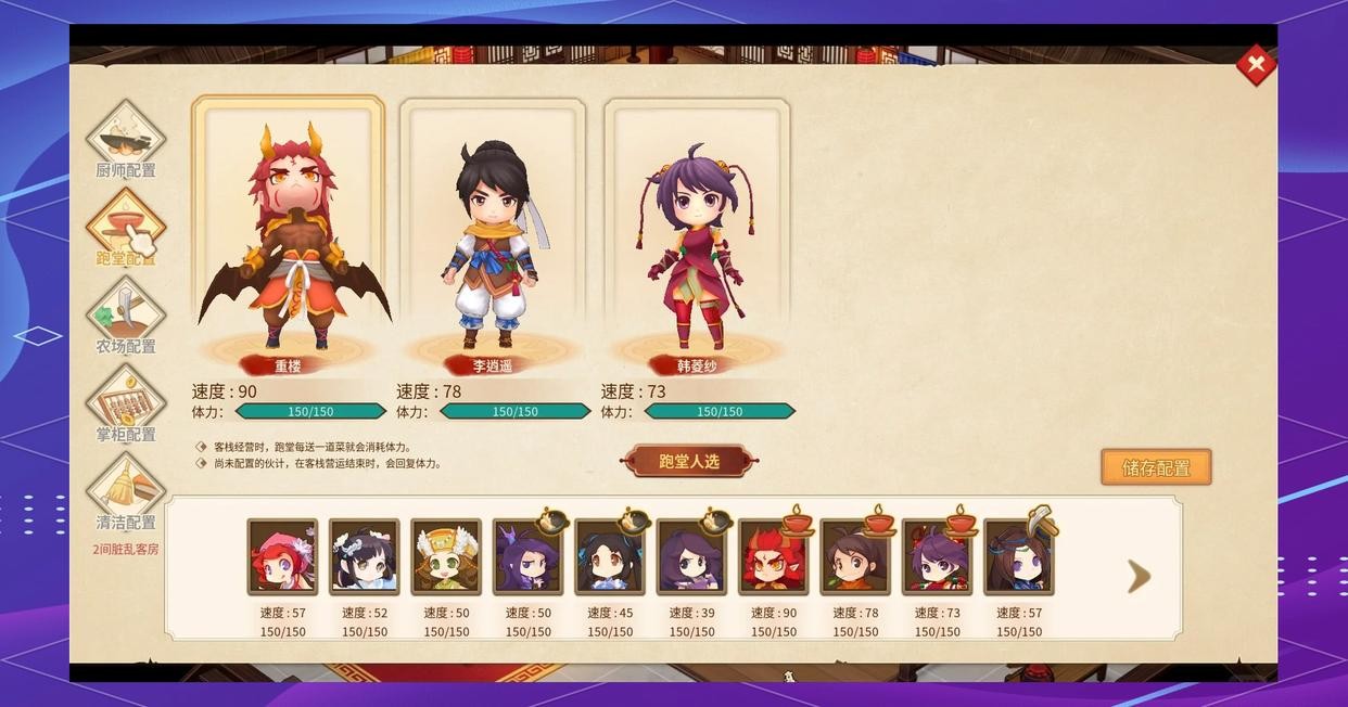 2、通过训练、战斗、探索提升角色属性,如跑堂可提升速度,厨师可解锁高级菜谱。