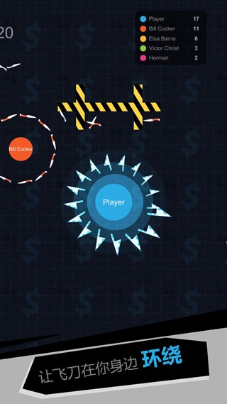 换一换我飞刀玩得贼6是睡神飞工作室打造的创新io类休闲竞技游戏,开局仅有少量飞刀,需在地图中拾取散落飞刀壮大自身,飞刀环绕形成防御圈,数量越多战力越强。需在地图中收集飞刀、击败对手,不断壮大自身战力,最终成为全场唯一存活者。模拟飞刀飞行、碰撞、反弹的真实轨迹,飞刀之间碰撞会产生清脆音效与震动反馈,击中敌人时的特效与飞刀掉落的视觉冲击,让每一次交锋都极具爽感。我飞刀玩得贼6不同飞刀皮肤拥有专属特效与音效,防御时的光晕特效、攻击时的飞刀激射效果!