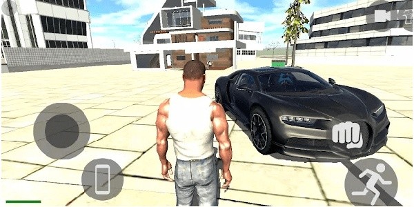 2、通过控制摇杆让人物走到房子外骑上摩托车,点击左右两侧的功能按钮控制车辆。