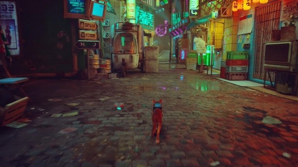 3、通过猫咪的眼睛观察世界,探索这个充满霓虹灯光和脏乱街道的赛博朋克城市。