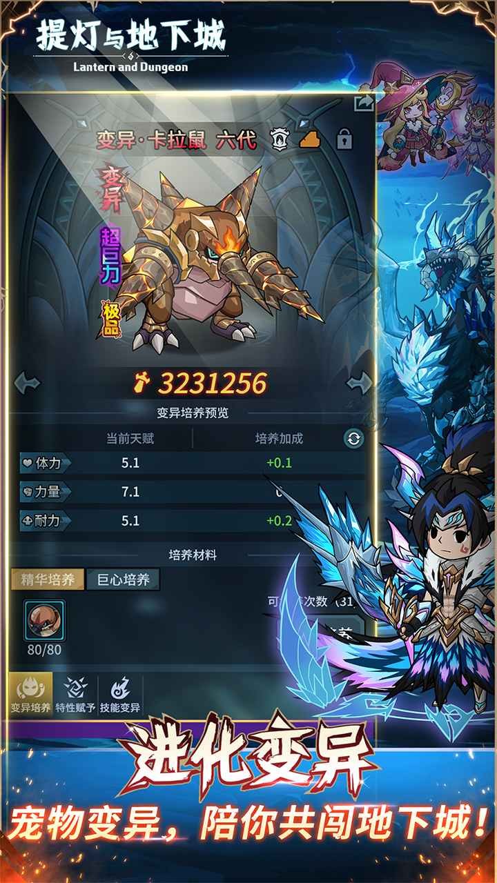 换一换提灯与地下城是一款养成萌宠闯荡地下城的冒险游戏,随机的地图开启精彩的冒险挑战。上百种宠物可以自由培养,不同宠物拥有专属技能与成长路线,搭配出多样战斗组合,应对各种考验。提灯与地下城还引入了独特的提灯机制,提灯亮度影响怪物强度与掉落,玩家需在探索中平衡风险与收益,增添游戏深度。提灯与地下城拥有丰富的装备系统,从武器到防具,从饰品到特殊道具,每件装备都有独特属性,助力玩家应对挑战,让你在随机地图与宠物养成中体验步步为营的刺激感。