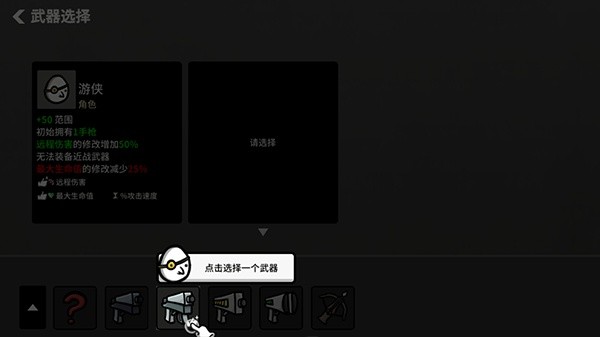 3、选定角色后,可以挑选武器。随着技能的逐步解锁,最终可选择多达六种武器。