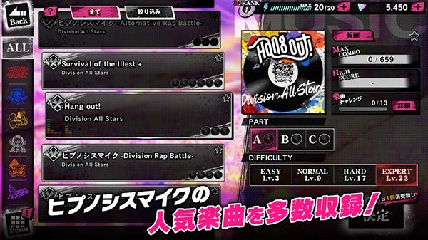 催眠麦克风最新版可以给你带来无比欢乐的节奏挑战,成为舞台当中的焦点,完成各种高难度关卡。根据不同曲目的节奏变化,灵活调整操作策略,提升自己的节奏感和反应能力。带给你精彩绝伦的音乐挑战,解锁更多强力角色和炫酷曲目。化身怀揣音乐梦想的挑战者,凭借高超的操作去完成所有歌曲,以更高的评分获得排名。