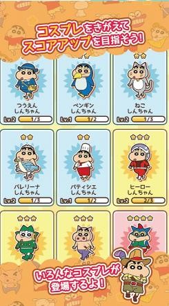 1、 个性化装扮系统丰富多元,从搞怪头饰到主题服饰,数百种搭配自由组合,打造专属风格的蜡笔小新。